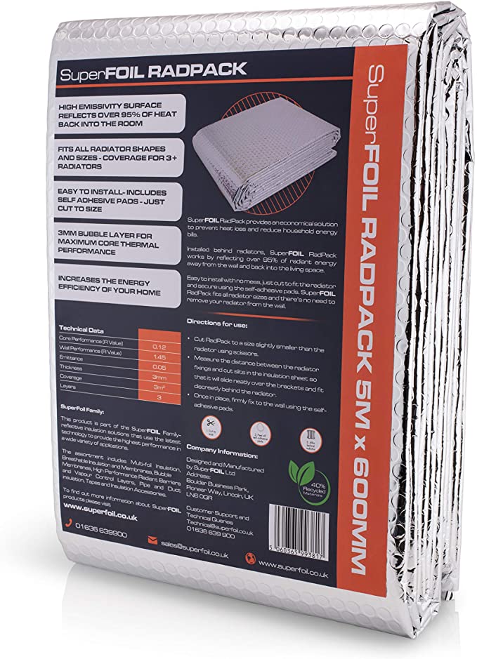Fixed behind your radiators, they reflect heat from the radiator back into the room, instead of letting the heat out through an external wall. They can produce the most benefit when installed on uninsulated solid walls.
