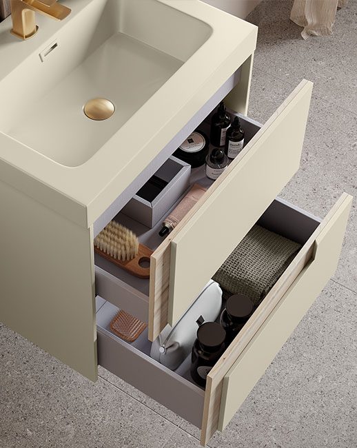 Align wall hung furniture features a linea textured finish with soft horizontal fluted lines and a unique wrap around drawer box. Soft close comes as standard on all units, with basin units available with a ceramic sit on basin or with a countertop and washbowl. align is available in three finishes, Matt cotton, Matt Mineral Greay and Matt Willow Green.