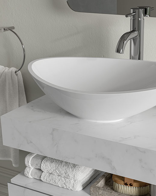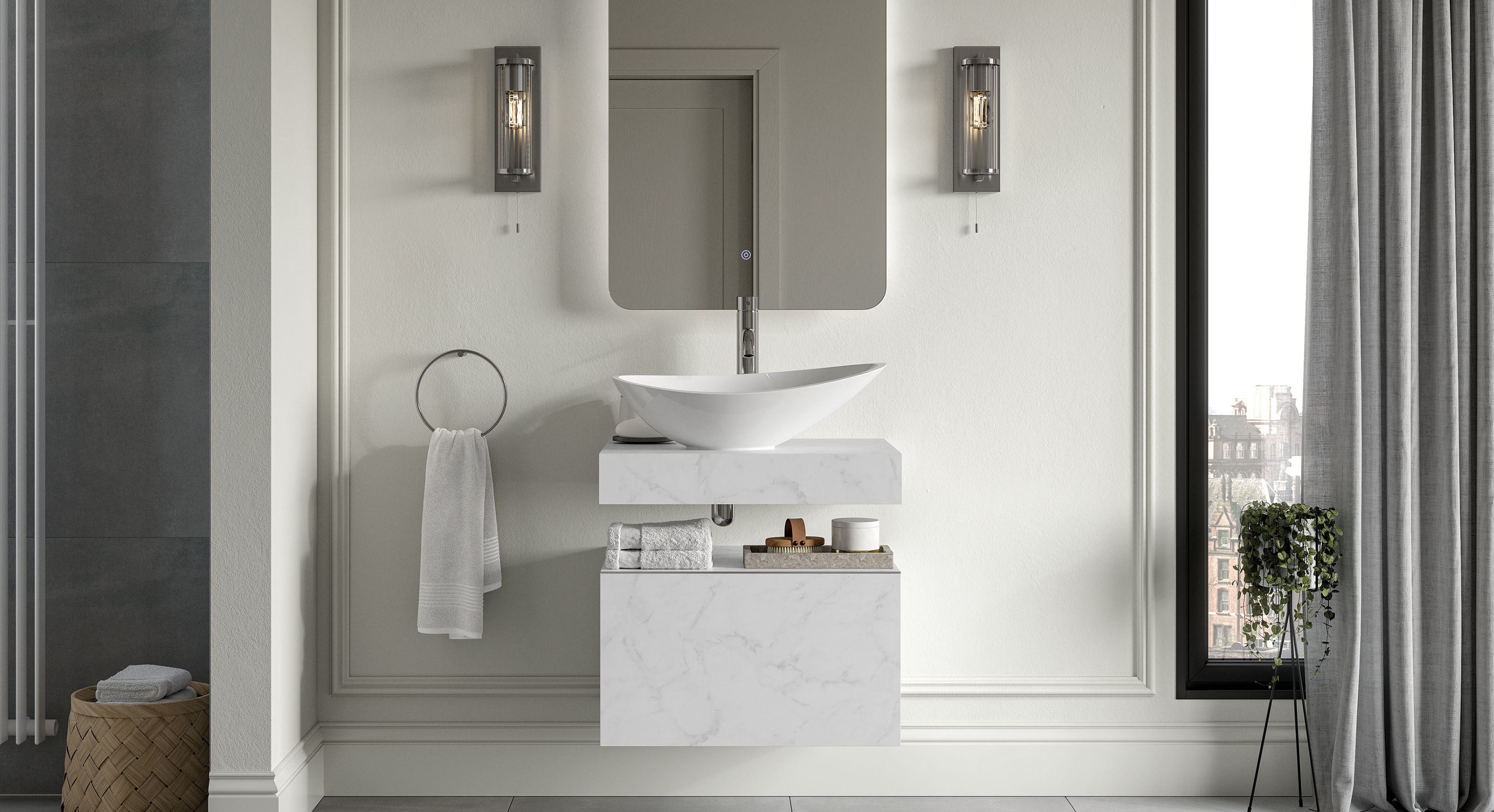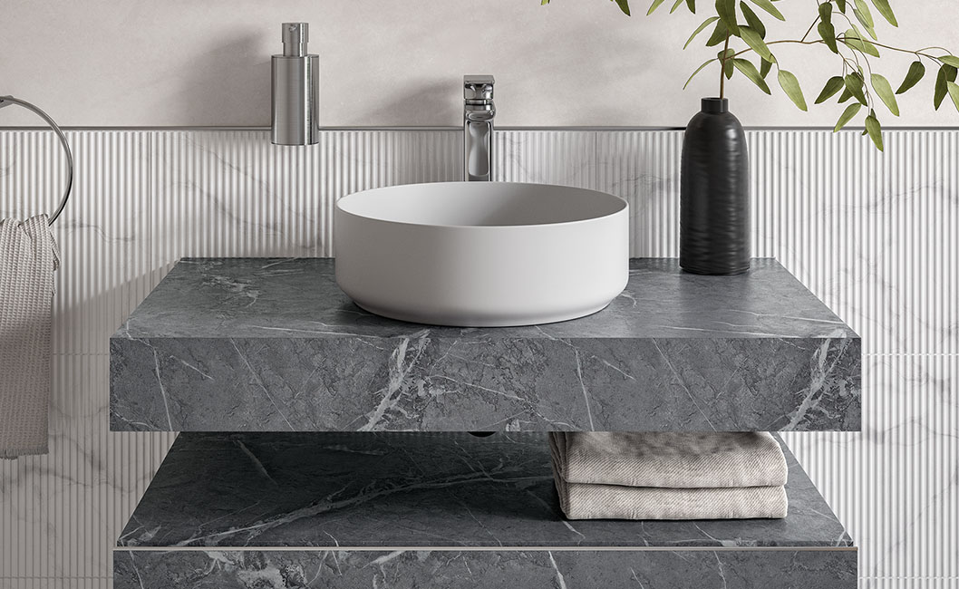The new Natural range of wall hung furniture captures the trend for natural finishes, the range offers a countertop shelf and a drawered storage unit. Available in two natural finishes, greay and white marble.
